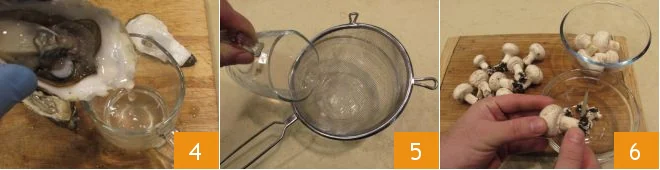 Open the oysters and collect their liquid in a small bowl 4, then strain it through a sieve 5 and detach the oyster from the shell. Brush half of the shells because they will be used to hold the oysters and the breadcrumb topping. Now focus on the breadcrumb topping: clean the champignon mushrooms 6