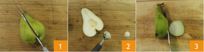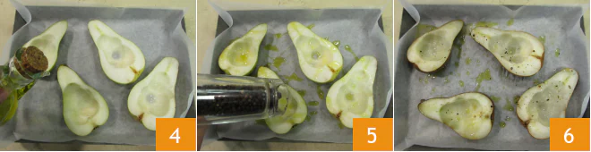 To make the baked pears with gorgonzola and honey, first wash and dry the fruits. Cut the pears in half lengthwise 1 and remove the core 2 and a small portion of the flesh to create a "boat" effect. Remove a small part from the skin side to lay them more comfortably on the baking tray 3.