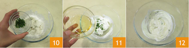 Add the chopped chives 10, honey 11, and mix with a spoon to emulsify 12.