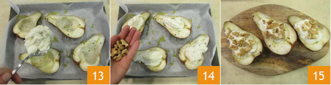 Stuff the cooked pears with the cream 13. Add the coarsely chopped walnuts on top 14 and serve your baked pears with gorgonzola and honey immediately.