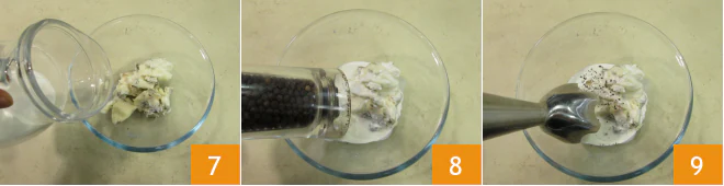 Prepare the filling: in a bowl, add the gorgonzola, cream 7, salt, and pepper 8, and blend with an immersion blender 9 until you have a smooth cream.
