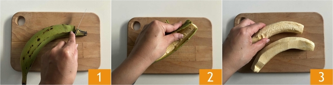 To prepare the baked plantain, first, you'll need to clean the plantain. Cut off and remove the ends of the plantain 1, then make incisions along the peel in various spots to peel it easily 2, remove the peel using a knife if necessary until fully peeled 3.
