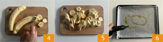 Once you have cleaned the plantain, slice it into pieces not too thin 4, about 1/4 inch thick will be fine. After slicing both plantains 5, line a baking tray with parchment paper and pour a drizzle of extra virgin olive oil over the bottom 6.