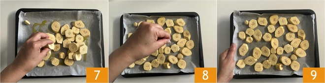 Then add the sliced plantain 7 and season with salt 8. Next, bake the plantain in a preheated fan oven at 392°F, on the middle rack, for about 10 minutes, flip it, and continue cooking for another 10 minutes 9.
