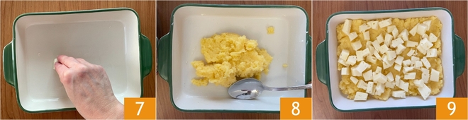 Butter a baking dish about 9x7 inches 7, cover the base with a portion of the polenta 8, and distribute the cubes of Asiago 9.