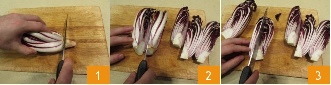 To prepare the baked radicchio, start by cleaning it. Remove the outer leaves, if damaged, and the stem 1. Then cut each head into 4 parts by first dividing it in half 2 and then into quarters 3. Rinse thoroughly to remove any soil residues.