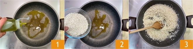To prepare the baked saffron rice with speck and brie, first bring a pot of water to a boil that you will use to cook the risotto. Heat the oil in a pan 1, then add the rice 2 and toast it for a few minutes, stirring frequently, until it feels hot to the touch 3.