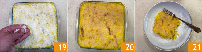 Mix well 16, then transfer the risotto to a 9.5x9.5 inch baking dish 17 and level the surface 18.