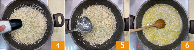 Salt 4 and cook the rice by adding a ladle of hot water at a time 5. Always make sure that the liquid is absorbed before adding the next ladle 6.