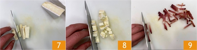 Meanwhile, cut the taleggio first into slices 7 and then into cubes 8. Cut the speck into strips 9.