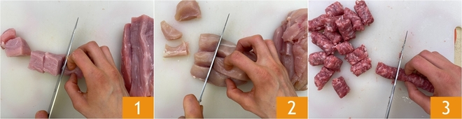 To prepare the baked skewers, first soak 12-14 wooden skewers in water to prevent them from burning in the oven. Now take the veal and cut it into 3/4 inch chunks 1, then do the same with the chicken 2 and the sausage 3.