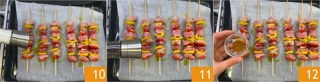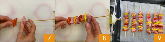 Now you can start assembling the skewers: take the first wooden skewer, start with a piece of bell pepper, then add a piece of meat of your choice 7. Continue this way, alternating the bell peppers and different types of meat 8. Altogether, you will have 12-14 skewers. Arrange them on two baking sheets lined with parchment paper and drizzle them with a bit of oil 9.