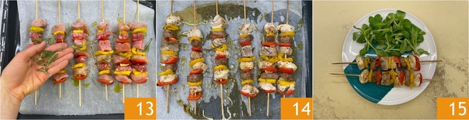 Finally, add the rosemary sprigs 13. Bake in a static oven at 356°F (180°C) for 20 minutes, then for the last 5 minutes, raise the temperature to 392°F (200°C) and turn on the grill. Take them out 14 and serve your baked skewers hot 15!