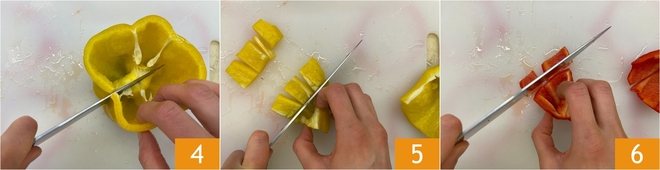 Clean the bell peppers, removing the stem and seeds. First, slice them into strips 4 and then into cubes the same size as the meat 5 6.