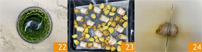 Blend until you obtain a smooth and fragrant sauce 22, adding a bit of water if necessary to adjust the consistency. Once the fish is ready, take it out 23 and cut the rolls in half 34.
