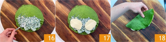 Then fill your crepes, spreading the cream only on half 16. Place two thin slices of provola on top 17 and fold it into a half-moon shape 18.