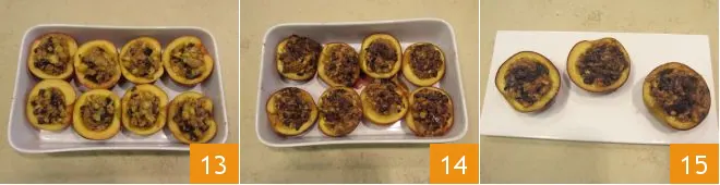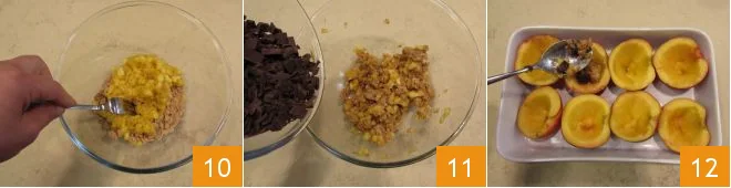 Mix the ingredients 10 with a fork. Then also add the chocolate 11 and combine it with the ingredients. Finally, place the peaches in a lightly buttered baking dish close to each other with the hollow facing up, preferably without leaving gaps. Fill them with a few tablespoons of the filling, shaping it into a small dome 12.