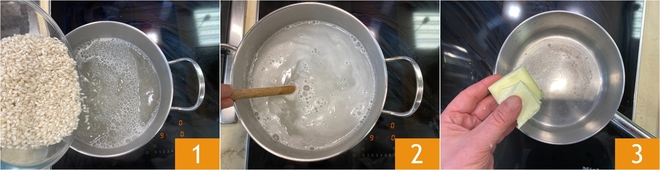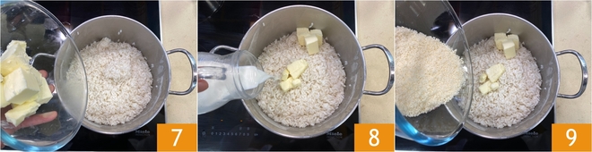 Drain the rice al dente and stir in the remaining 13 tbsp of butter 7, the milk 8, and 1/3 cup of grated Parmigiano Reggiano 9.