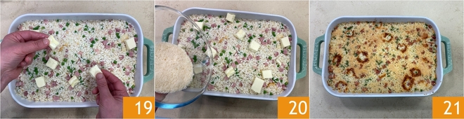 Place the reserved scamorza pieces on top 19 and the remaining 2 tbsp of Parmigiano 20. Bake in a static oven, preheated to 428°F, in grill mode for 15-20 minutes. Remove from the oven 21 and serve your baked white rice!