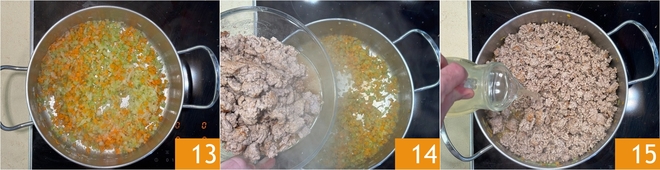 When the sauté is soft and fragrant 13, add the browned meat 14 and pour in the warm Beef Broth 15.