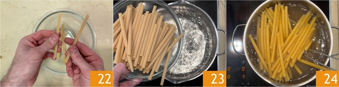 Then move on to the pasta: break the ziti in half 22 and cook them in boiling salted water for about 5 minutes 23, then drain them 34.