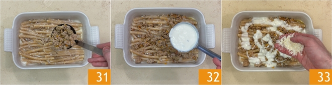 Cover with more ragù 31, a few tablespoons of béchamel 32, and a handful of grated Parmigiano Reggiano 33.