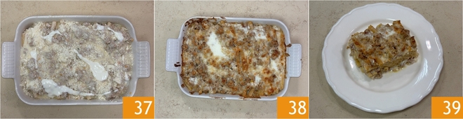 Transfer the pasta to a large bowl 25. Add a third of the béchamel 26 and a third of the ragù 27.