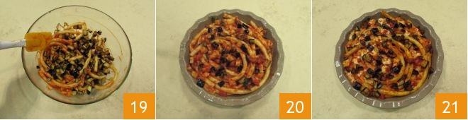 add the fresh torn basil 16, the diced Provola 17, and the eggplants 18.