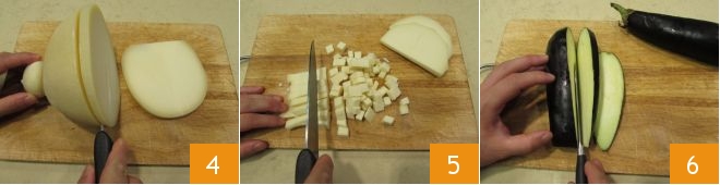 Meanwhile, cut the Provola Silana first into slices, then into strips, and finally into small cubes 4, do the same with the eggplants, slicing them thinly 6