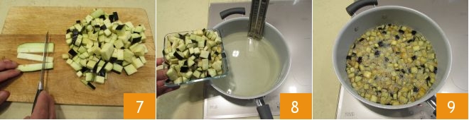 then into strips, then into small cubes 7. In a pot, add vegetable oil and when it reaches a temperature of 340°F-355°F, fry the diced eggplants 8. Let them sizzle 9