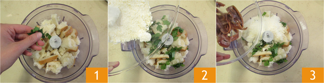 To prepare the baked zucchini flowers with Grana Padano and anchovies, start with the filling: place the coarsely broken bread, parsley 1, Grana Padano PDO2, and drained anchovies 3 in a food processor.