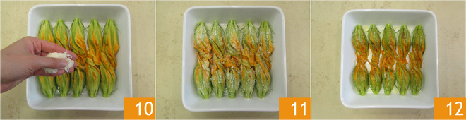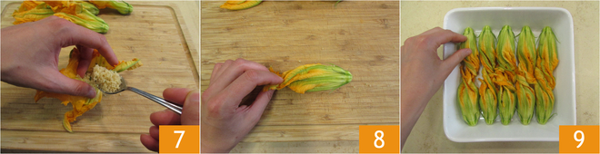 Fill them with a teaspoon, applying little pressure to avoid breaking the flower 7. You will need about 3 teaspoons of filling for each zucchini flower. Close them by gently twisting the tips 8 and arrange them alternately in a baking dish 9.