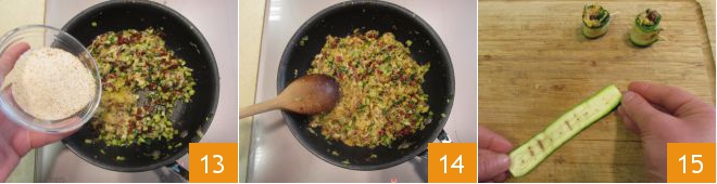 Finally, add the breadcrumbs 13, mix one last time 14 and set aside the filling. Everything is ready to assemble your rolls: take a grilled zucchini and lay it on a cutting board 15.