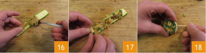 Spread the filling along the zucchini 16 and roll it up on itself 17 to form the roll. Skewer the roll with a toothpick to prevent it from unrolling 18.