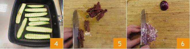 Grill them on both sides just enough to create the typical grill marks 4. As they are ready, set them aside to cool. Drain the sun-dried tomatoes and capers and chop them with a knife 5. Clean and chop the red onion as well 6.
