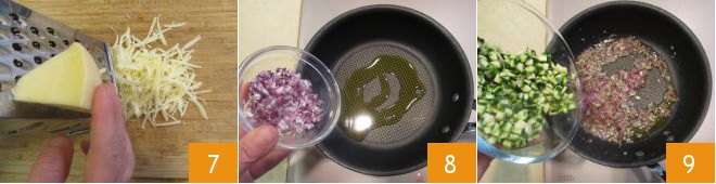 Grate the cheese with a wide-mesh grater 7. Heat a pan with a little oil, add the chopped onion 8. Sauté over low heat for 6-7 minutes. When the onion is well softened, add the zucchini cubes 9 and the thyme leaves. Continue cooking over moderate heat for a few minutes.
