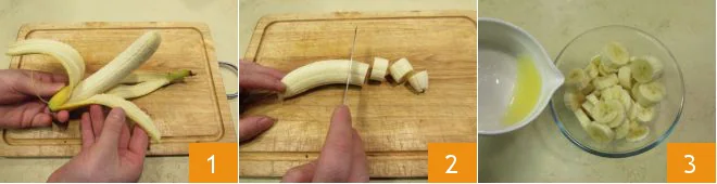 To prepare the banana bread, start by peeling the bananas 1 and cutting them into slices 2. Pour them into a bowl and sprinkle with lemon juice to prevent them from blackening 3.
