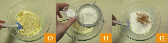 Mix with a flexible spatula 10 and add the sifted flour with baking soda and baking powder 11. Flavor with cinnamon 12 and stir again.