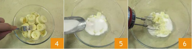 Crush them with a fork 4 to reduce them into a puree, then set aside. In another bowl, pour the chopped butter, soft but still pliable, and the sugar 5. Whisk with a hand mixer 6
