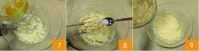 and when you have obtained a homogeneous mixture add the eggs, possibly one at a time to combine them better 7. Add a pinch of salt 8, then pour in the banana puree 9.