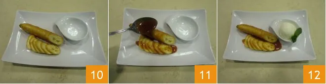 Now that the bananas are cooked, cut half a banana into slices 10 and arrange it on a dessert plate. Place the other banana alongside the sliced one and pour the caramel sauce over both 11. You can serve leaving the flambéed banana whole or cutting it, entirely or partially, into slices to place alongside each other for an elegant presentation of the fruit. You can also serve these delicious bananas flambé with a scoop of vanilla or chocolate ice cream.