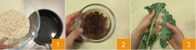 To make the barley and kale salad, first cook the barley in salted boiling water 1 for about 15 minutes or for the time indicated on the package. Meanwhile, soak the raisins in a small bowl with lukewarm water to rehydrate them 2. Remove the leaves from the kale, eliminating the more fibrous central part 3.