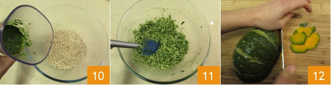 Pour the barley into a bowl and dress with the kale pesto 10, mix and set aside 11. Now clean the pumpkin: cut it in half, remove the seeds and the peel 12.