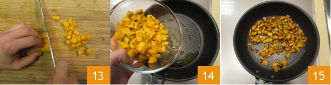 Cut the pumpkin first into wedges and then into small cubes 13. In a pan, pour a drizzle of olive oil, heat it, and then add the pumpkin 14, sautéing it for a few minutes until it is golden and well cooked 15.