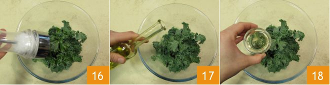 Now place the other half of the cleaned kale in a bowl: season with salt 16, oil 17, and vinegar 18,