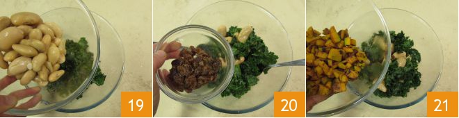 then add the beans 19, the rehydrated and well-drained raisins 20, and the pumpkin 21.