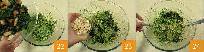 Finally, combine the kale salad with the barley 22 and incorporate the peanuts last 23. Mix and serve your tasty barley and kale salad 34!