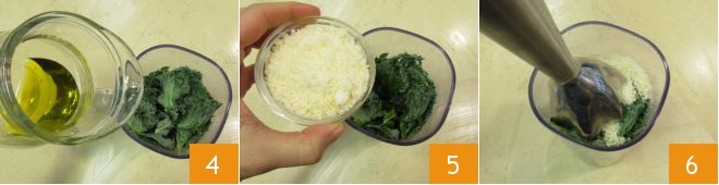 Wash and dry the leaves and then transfer half of them into the blender cup: add the olive oil 4, grated Parmesan 5, and blend with an immersion blender 6,