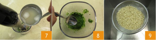 adding just enough barley cooking water 7 to obtain a creamy pesto 8 that you will momentarily set aside. In the meantime, drain the barley which will be cooked through 9.
