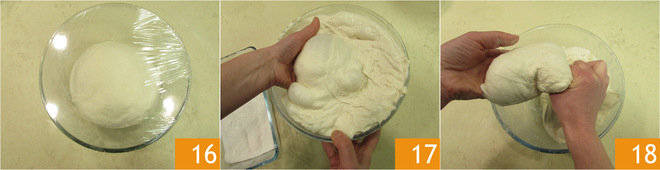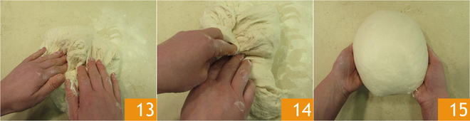 Dust the work surface with a little pinsa flour. Turn the dough out onto the surface and perform folds as follows: take the edge of the dough in turn and pull it toward the center. You will see the dough start to become smoother. Then flip it and shape it into a ball, rolling it on the surface to seal the closure.